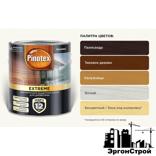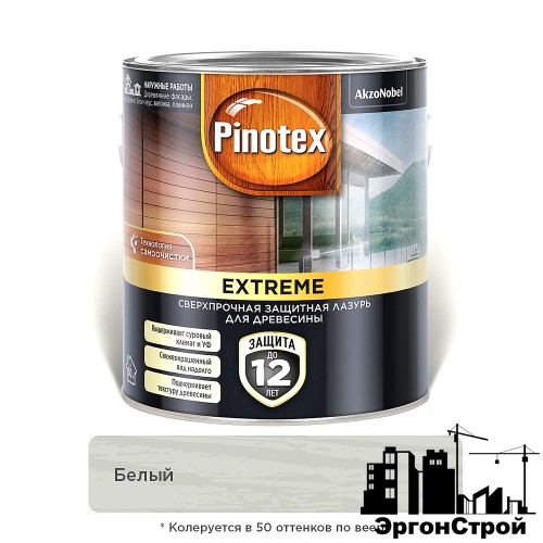 Pinotex Extreme – сверхпрочная лазурь на гибридной основе с технологией самоочистки для защиты древесины. Благодаря уникальной технологии частицы грязи смываются дождём и поверхность сохраняет свежеокрашенный вид надолго. Гибридная формула с высоким содержанием алкидной эмульсии и акрилового полимера питает и создаёт особо прочное, эластичное покрытие, надёжно защищающее древесину даже в условиях сурового климата. В качестве растворителя используется вода, поэтому лазурь почти не пахнет, имеет низкое содержание летучих органических соединений, легко наносится и быстро сохнет. Полуматовое покрытие сохраняет видимой текстуру древесины. Содержит добавки против синевы и плесени.